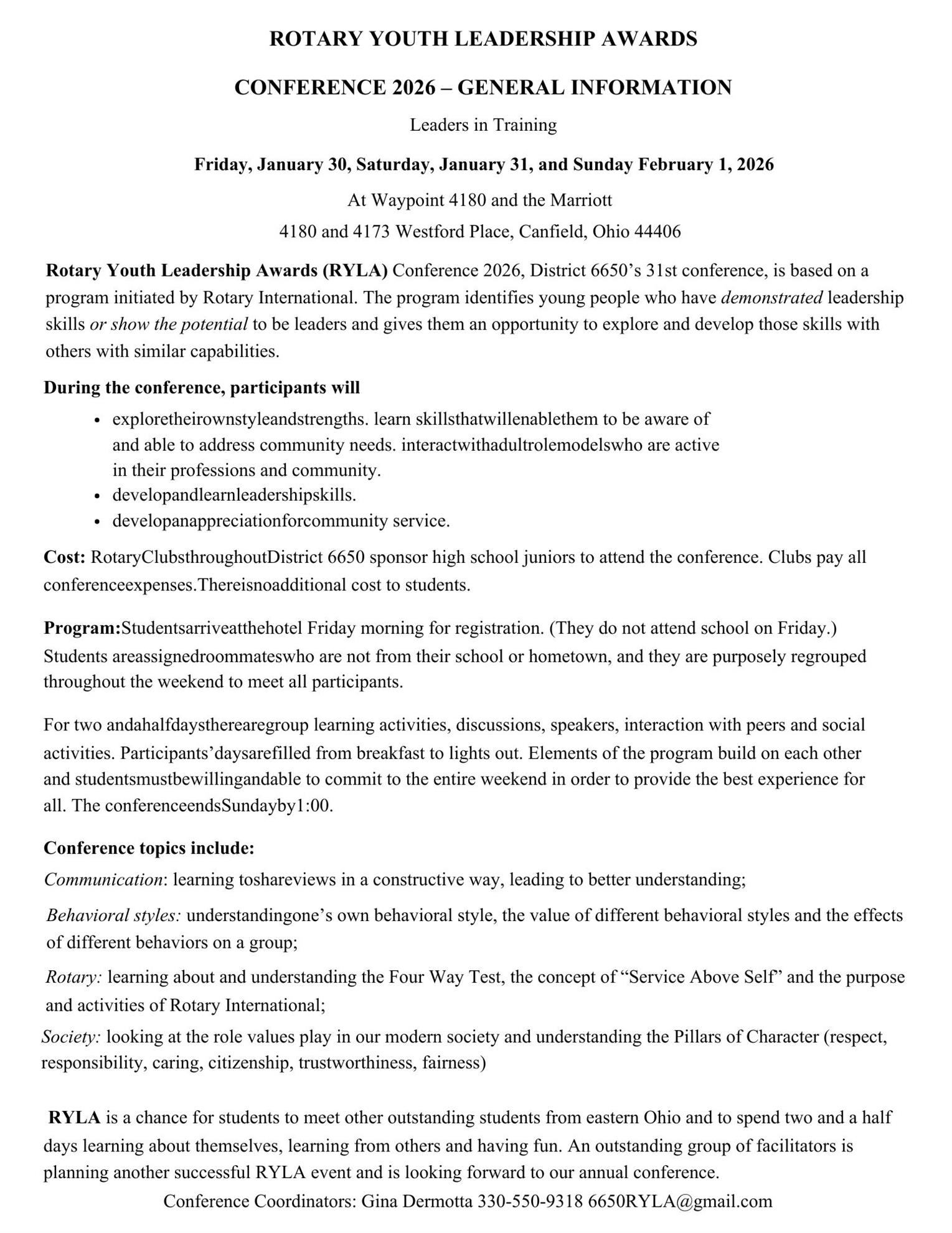 The weekend of January 16 – 19 our 25/26 Inbound students and 26/27 Outbound students attended the O-E Multidistrict Winter Conference at Blue Ridge Assembly in Black Mountain, NC. A total of 65 students, 25 parents, and 70 Rotarians gathered for training and fellowship. Outbound students began their orientation, and will be preparing over the next eight months to serve as young ambassadors on their own exchanges.