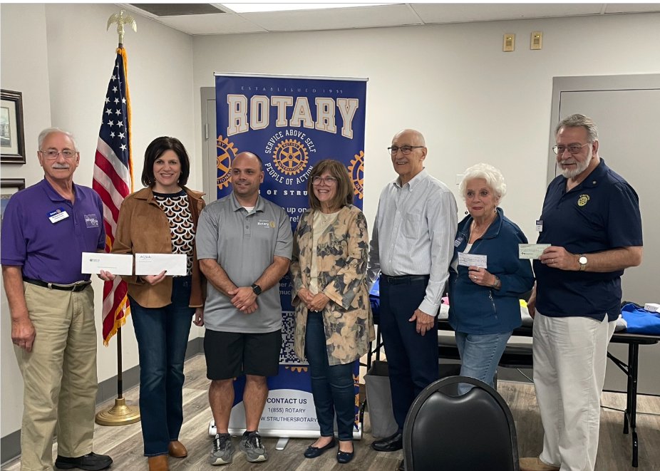 Pictured left to right are Rotarian Mike Krake from CASTLO, Rotarian Jennifer Johnson from Aqua Ohio, Struthers Rotary President Ryan Goist, Renee Fuller and Mike Iberis (Associate Director and Executive Director of Second Harvest Food Bank), Rotarian Mary Ann Morell and Rotarian Drew Hirt (President of FCSU Branch 682).